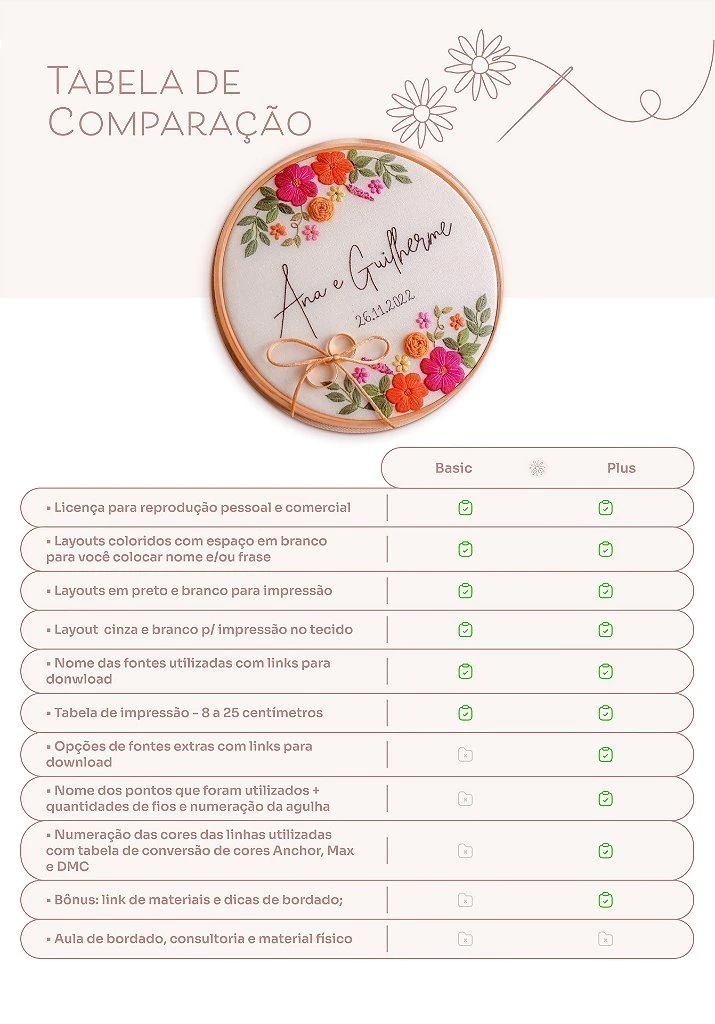 O serviço de Edição Personalizada oferece 1 folha no formato A4 com o risco para bordado em preto e branco, incluindo o nome, frase e/ou data de sua escolha, pronto para impressão. O documento será enviado como anexo em PDF ao final do e-mail. Caso prefira não adquirir este serviço, você poderá personalizar o nome por conta própria, seguindo as orientações disponibilizadas no e-mail.
